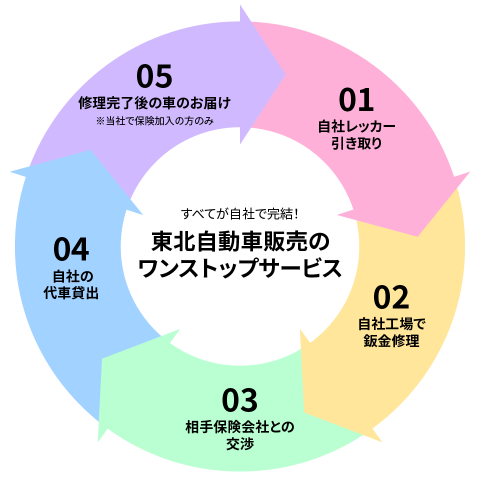 まずは東北自動車販売にご連絡ください。整備工場と保険加入先が別の場合、複数の連絡が必要ですが、当社で保険に加入していれば、電話一本で事故受付から修理まで一括でご対応いたします。
